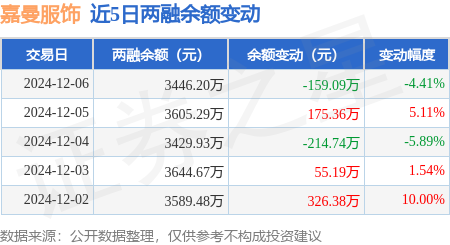 嘉曼服饰:12月6日融资买入330.88万元,融资融券余额3446.2万元